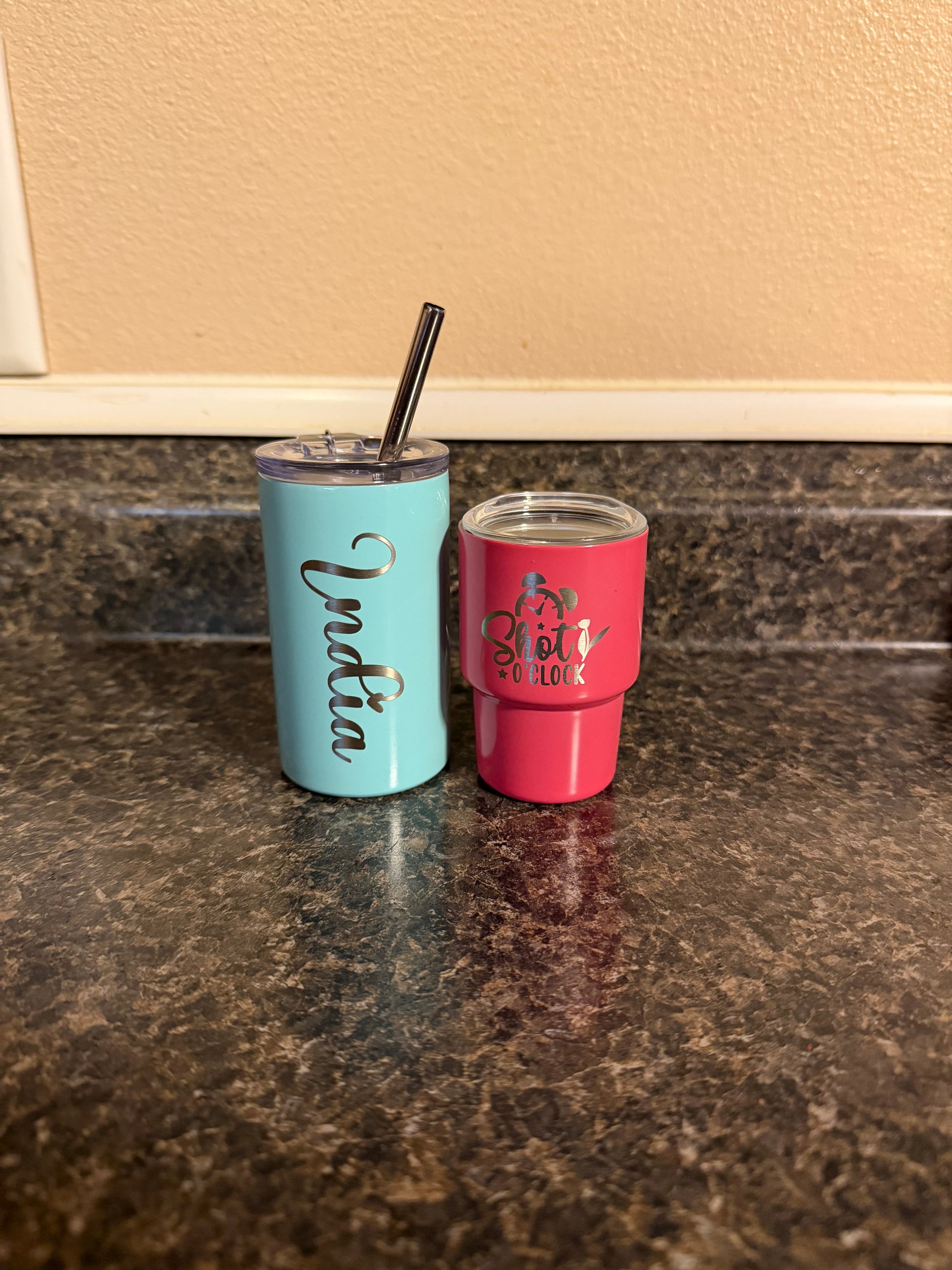 "Add a personal touch to your gift with our cute Mini Tumblers! With the option to customize with a name or short phrase, these mini-sized tumblers are perfect for any occasion. Give a unique and thoughtful gift that will surely make your loved ones smile. Cheers to that!"